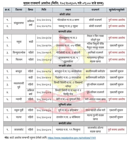 • ७. देशका विभिन्न राजमार्ग र सडक खण्डमा अझै यातायात अवरुद्ध, सडक खुलाउने कार्य उच्च प्रथामिकतामा