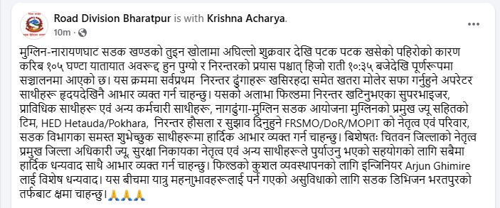 मुग्लिन-नारायणघाट सडक खण्डको तुइन खोलामा अघिल्लो शुक्रवार देखि पटक पटक खसेको पहिरोको कारण करिब १०५ घण्टा यातायात अवरूद्द हुन पुग्यो र निरन्तरको प्रयास पश्चात् हिजो राती १०:३५ बजेदेखि पूर्णरूपमा सञ्चालनमा आएको छ। यस क्रममा सर्वप्रथम निरन्तर ढुंगाहरू खसिरहदा समेत खतरा मोलेर सफा गर्नुहुने अपरेटर साथीहरू हृदयदेखिनै आभार व्यक्त गर्न चाहन्छु। यसको अलाभा फिल्डमा निरन्तर खटिनुभएका सुपरभाइजर, प्राविधिक साथीहरू एवं अन्य कर्मचारी साथीहरू, नागढुंगा-मुग्लिन सडक आयोजना मुग्लिनको प्रमुख ज्यू सहितको टिम, HED Hetauda/Pokhara, निरन्तर हौसला र सुझाव दिनुहुने FRSMO/DoR/MOPIT को नेतृत्व एवं परिवार, सडक विभागका समस्त शुभेच्छुक साथीहरूमा हार्दिक आभार व्यक्त गर्न चाहन्छु। बिशेषतः चितवन जिल्लाको नेतृत्व प्रमुख जिल्ला अधिकारी ज्यू, सुरक्षा निकायका नेतृत्व एवं अन्य साथीहरूले पुर्याउनु भएको सहयोगको लागि सबैमा हार्दिक धन्यवाद साथै आभार व्यक्त गर्न चाहन्छु। फिल्डको कुशल व्यवस्थापनको लागि Er. Arjun Ghimire लाई विशेष धन्यवाद। यस बीचमा यात्रु महनाुभावहरूलाई पर्न गएको असुविधाको लागि सडक डिभिजन भरतपुरको तर्फबाट क्षमा चाहन्छु।