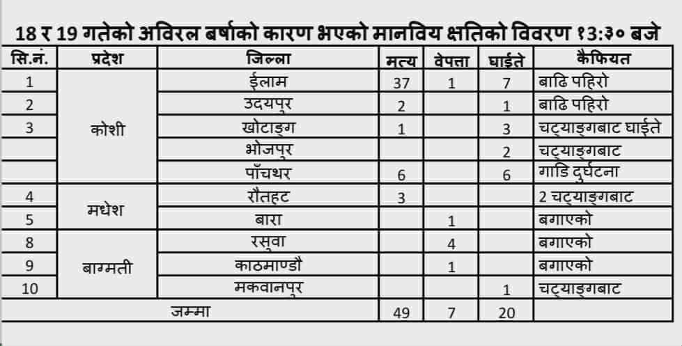 नेपाल प्रहरीले दिएको पछिल्लो विवरण अनुसार, देशभर ज्यान गुमाउनेको संख्या ४९ पुगेको हो । यो विवरण दिउँसो साढे १ बजेसम्म संकलन गरिएको प्रहरीले जनाएको छ ।