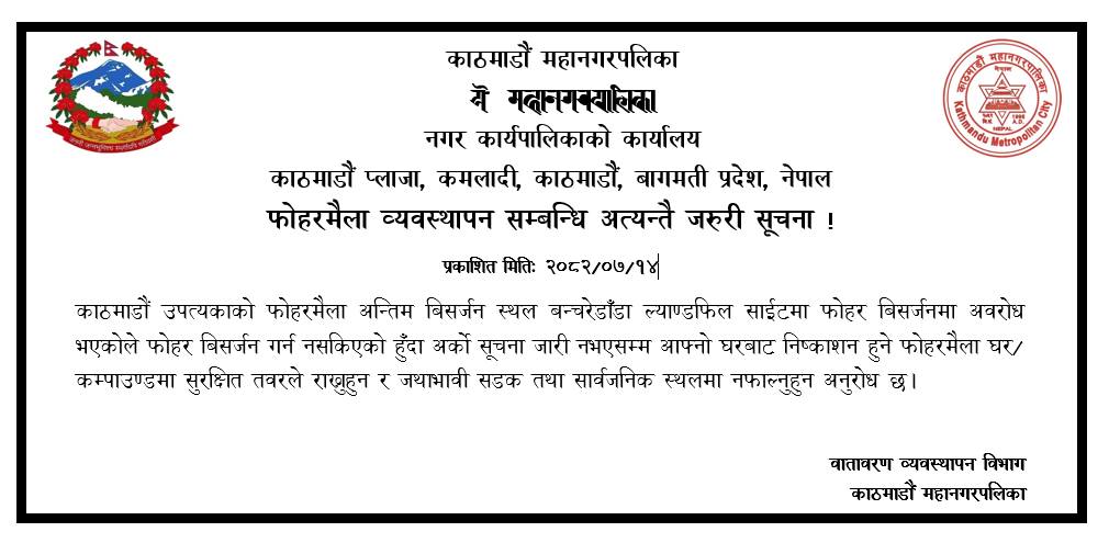 महानगले आज एक सूचना जारी गर्दै स्थानीयको अवरोधपछि फोहर बिसर्जन गर्न नसकिएकाले अर्को सूचना जारी नभएसम्म आफ्नो घरबाट निष्काशन हुने फोहरमैला घरर कम्पाउण्डमा सुरक्षित तवरले राख्न वातावरण व्यवस्थापन विभागले भनेको छ ।