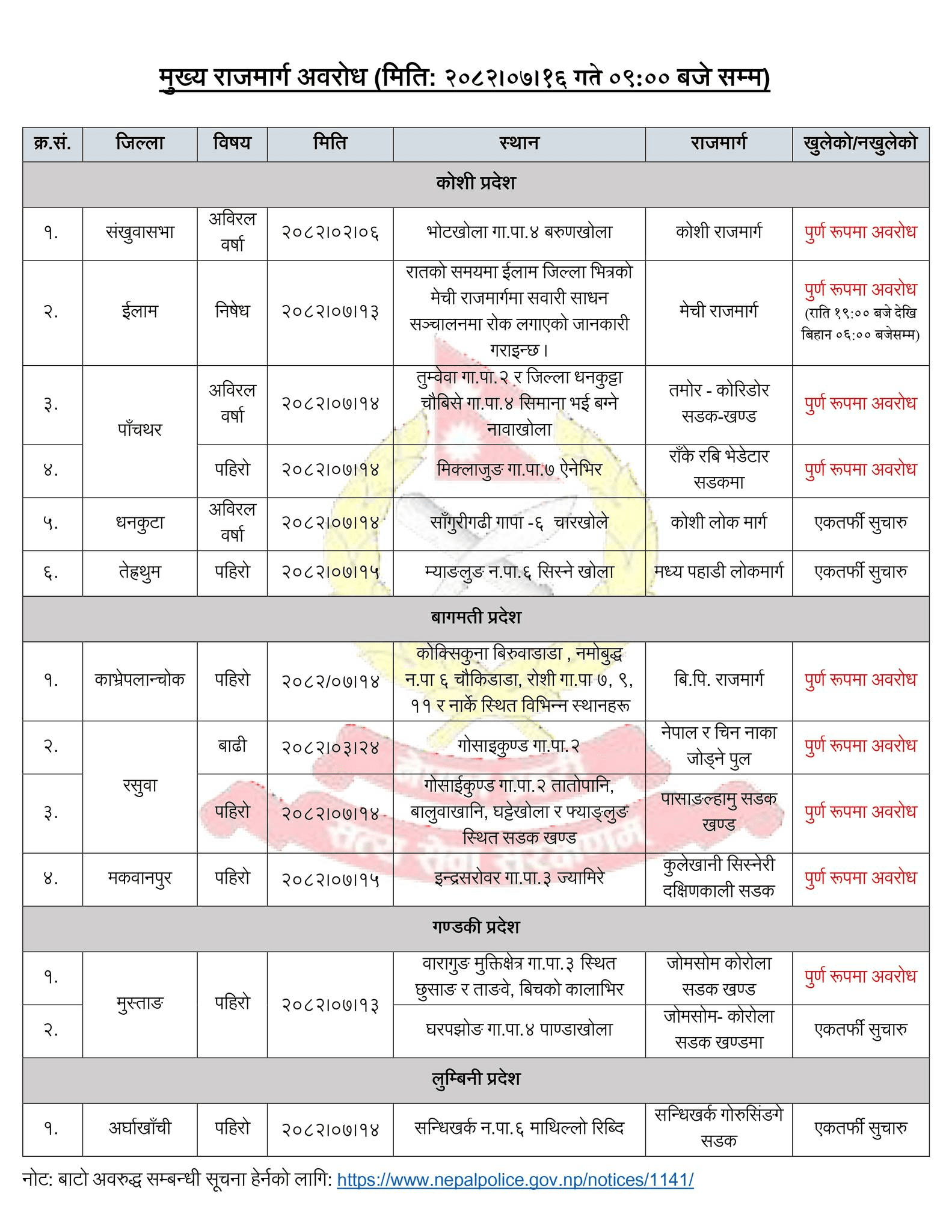 बाढी पहिरोका कारण देशका विभिन्न राजमार्गहरूमा सवारी आवागमनमा ठप्प रहेको छ । विशेषगरी कोशी प्रदेश र बागमती प्रदेशका केही मुख्य सडकहरू बाढी–पहिरोका कारण प्रभावित भएका छन् । गण्डकी प्रदेश र लुम्बिनी प्रदेशमा भने अवस्था सामान्य बन्दै गएको देखिएको छ ।