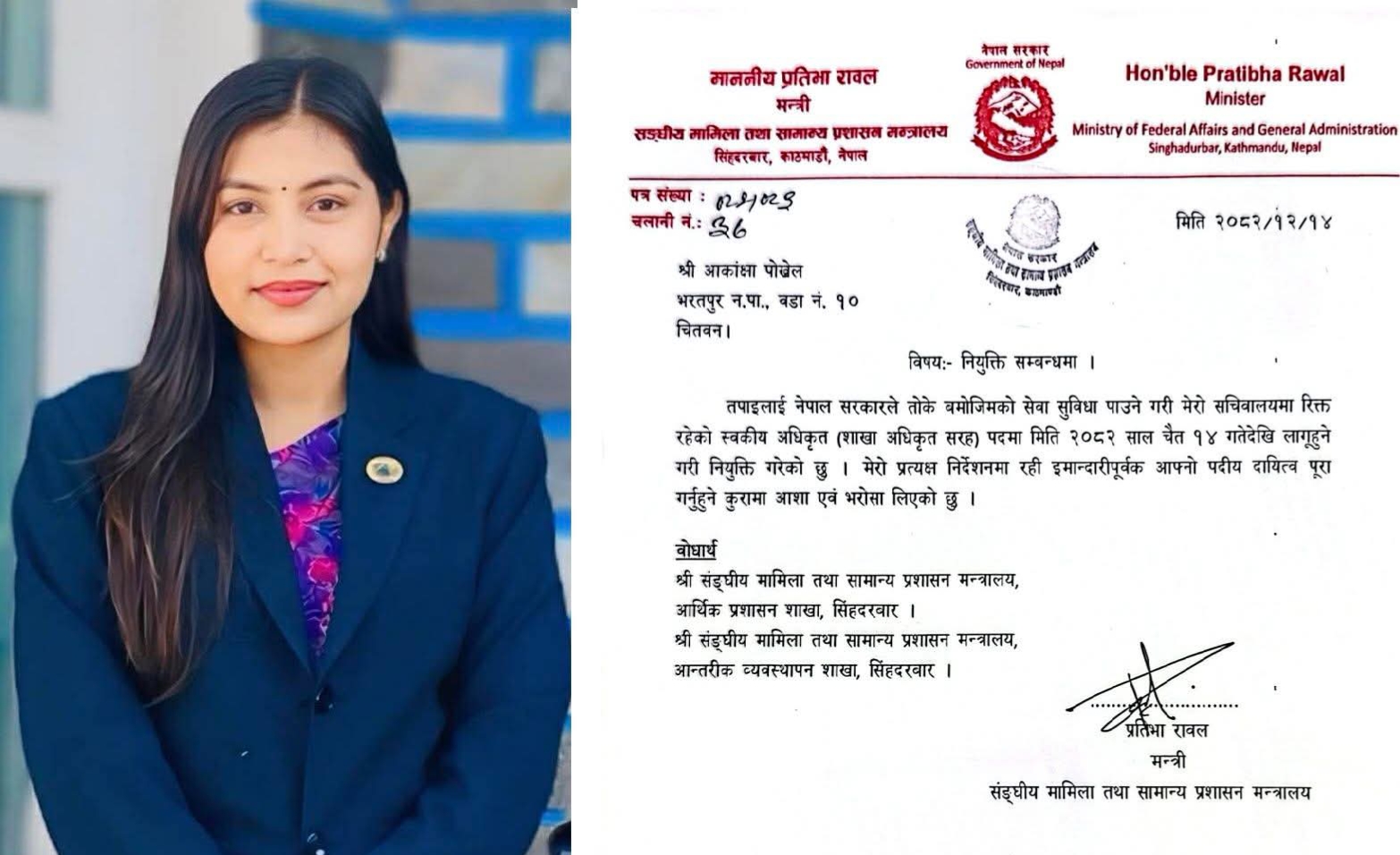 मन्त्री प्रतिभा रावलको स्वकीय सचिव पदमा आकांक्षा पोख्रेल नियुक्त