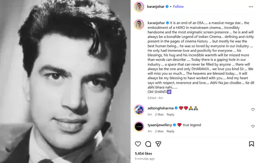 बलिउड फिल्म निर्माता करण जोहरले अभिनेता धर्मेन्द्रको निधन भएको पुष्टि गर्दै सामाजिक सञ्जालमार्फत श्रद्धाञ्जलि व्यक्ति गरेका छन् ।