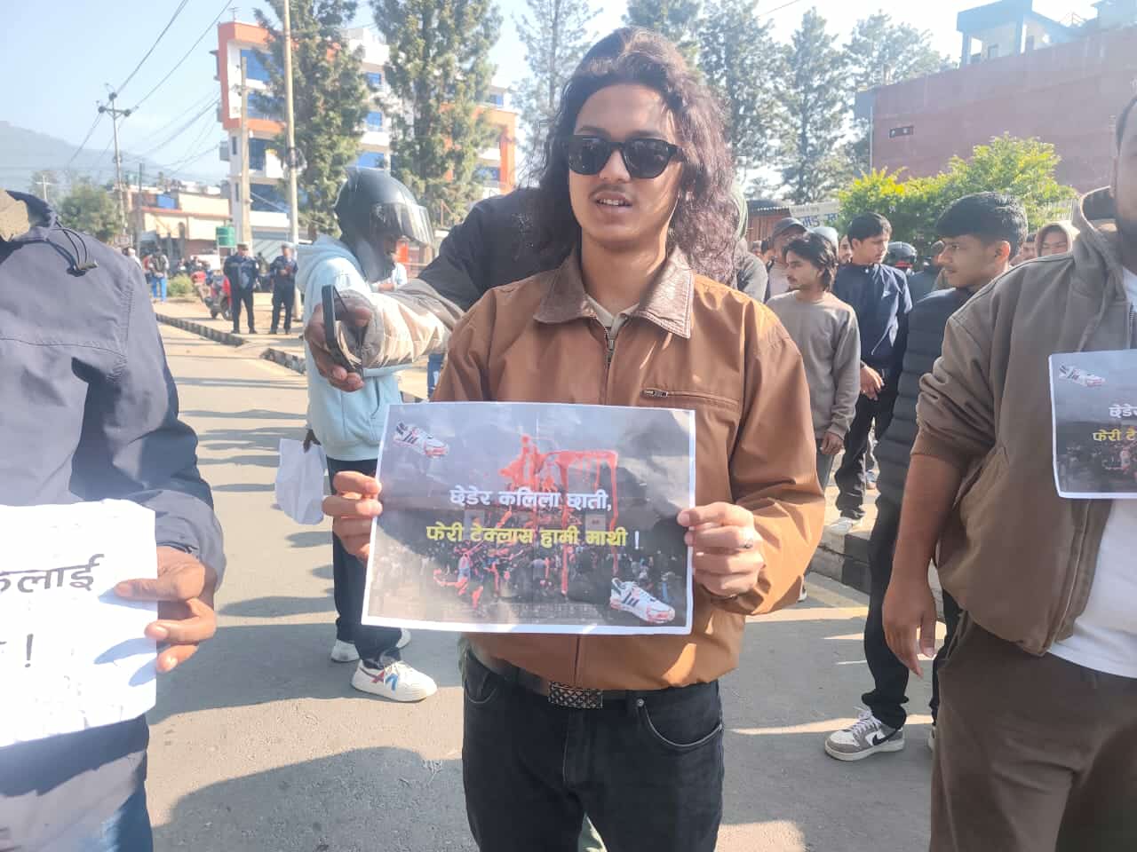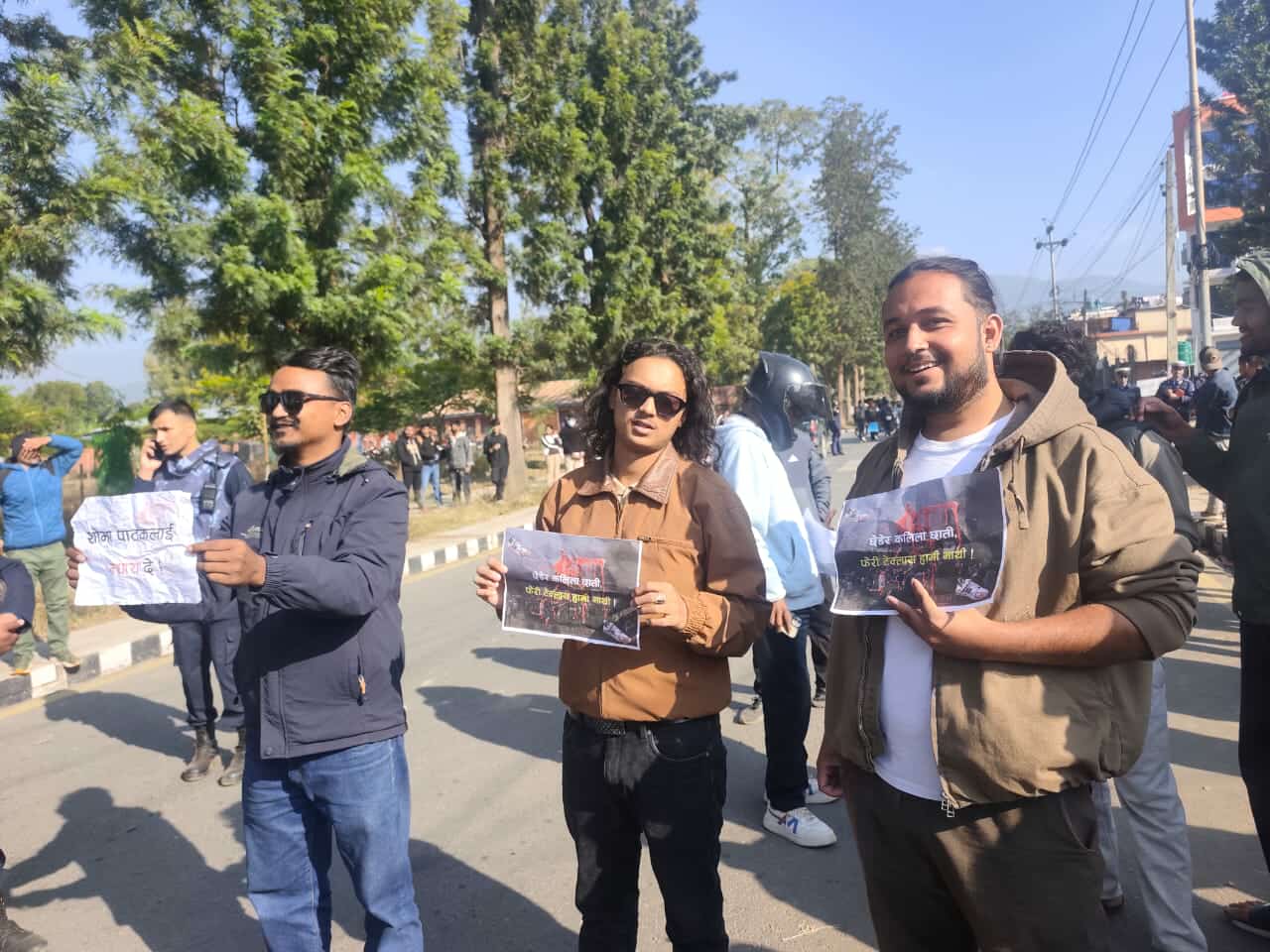 जेनजी समूहका युवा झन्डै पाँच सय मिटर पर बस्नेतको विरोधमा हातमा प्लाकार्ड लिएर उभिएका छन्।