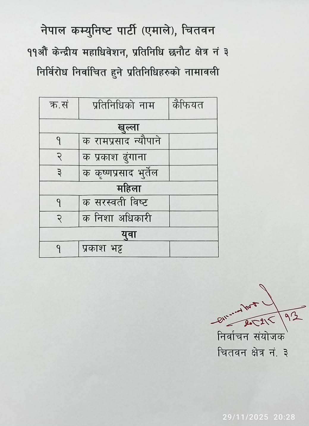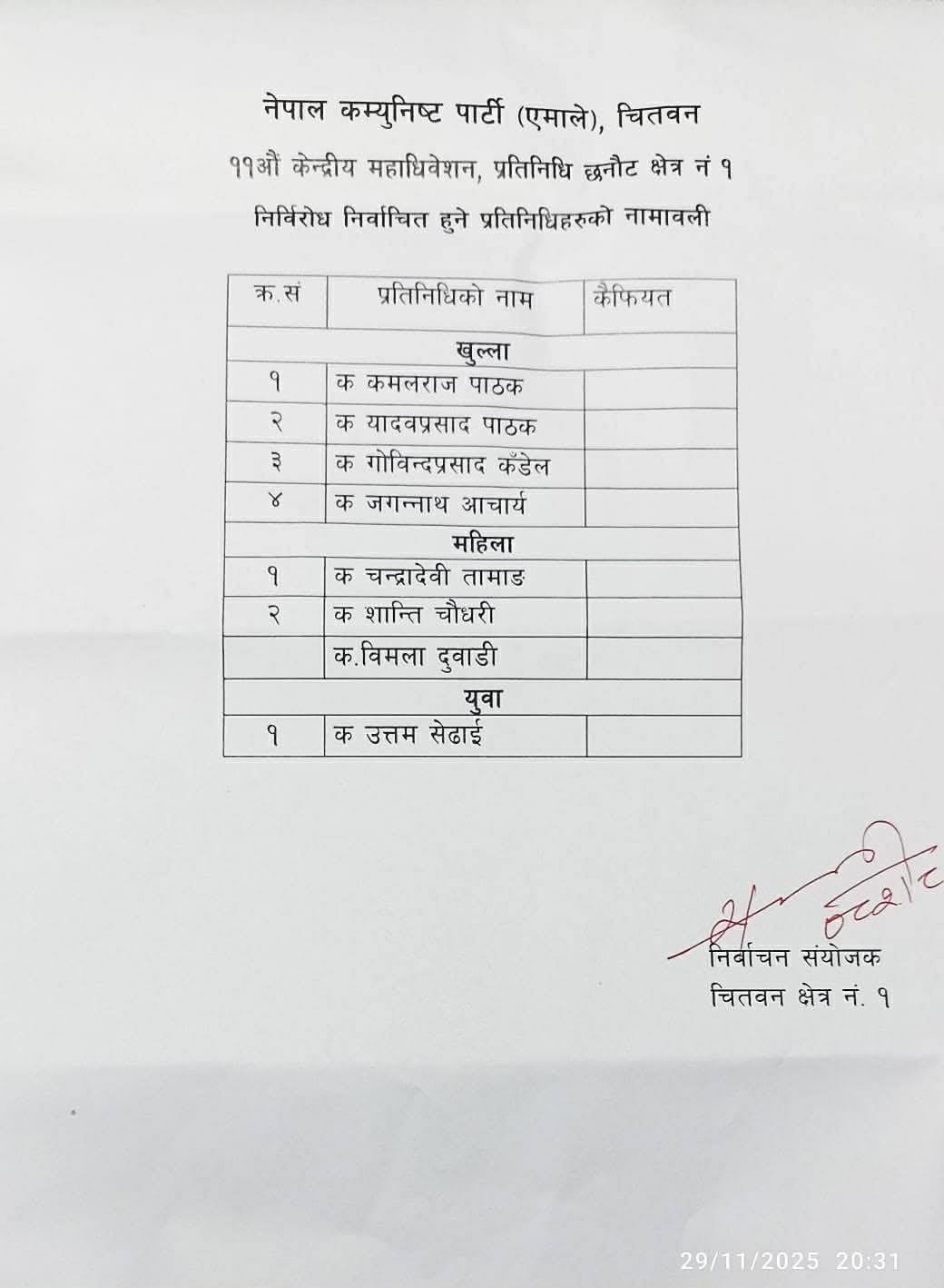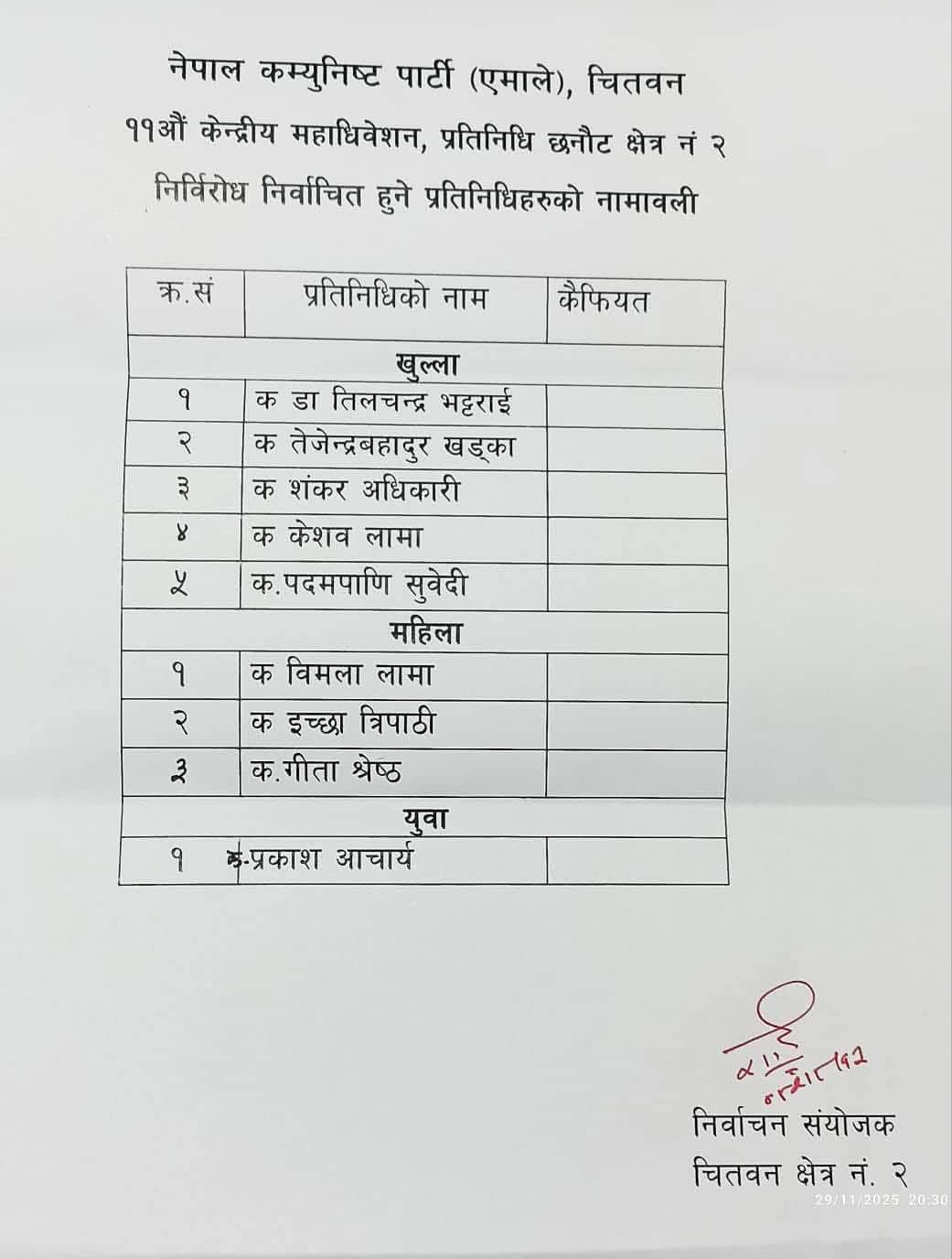 शनिबार साँझ चितवनबाट प्रतिधित्व गरेर जानेहरुको नाम सर्वसम्मतीबाट टुंग्याइएको एमाले चितवनले जनाएको छ ।