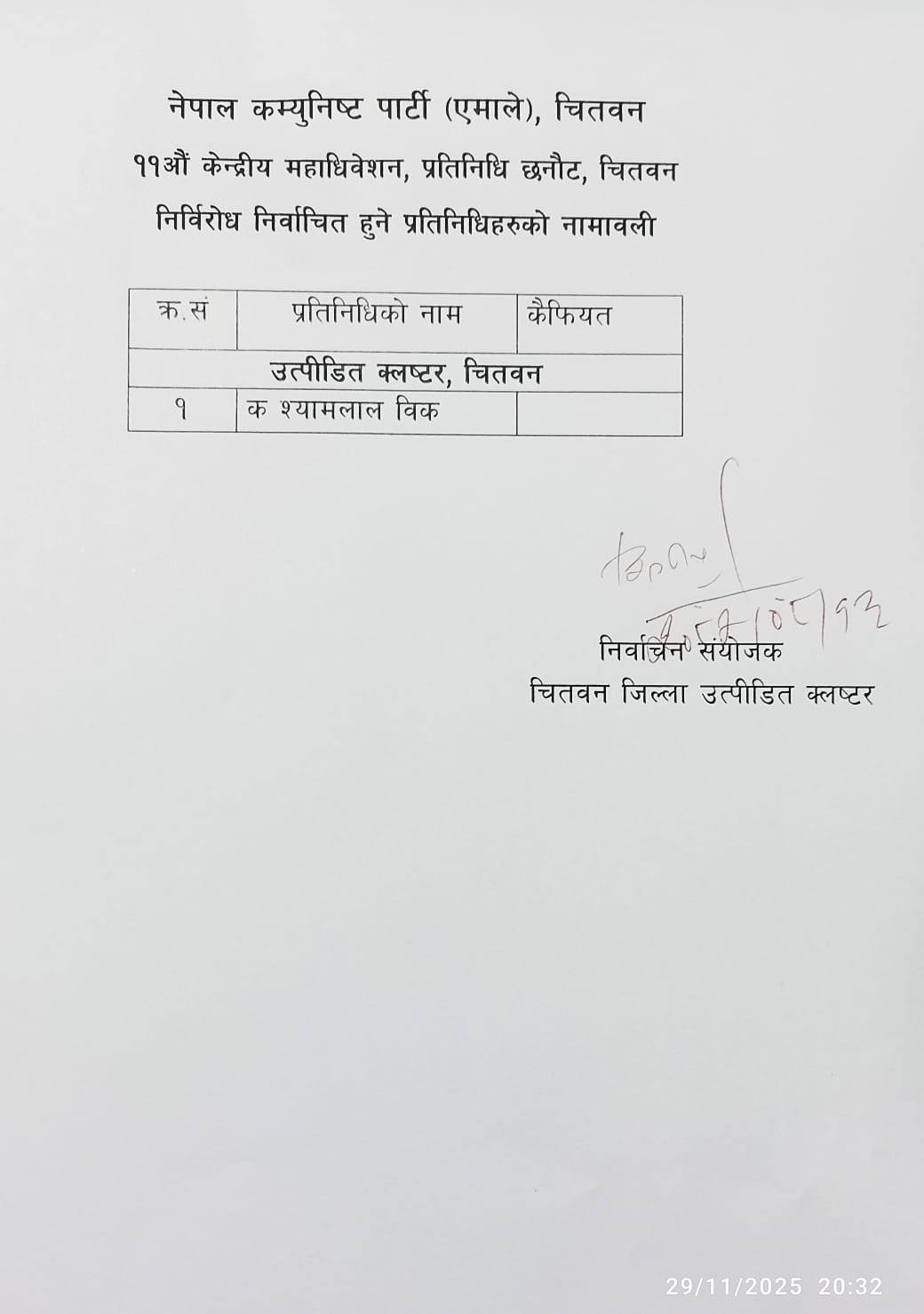 चितवन जिल्लाबाट उप्पीडित क्लष्टरतर्फ श्यामलाल विक प्रतिनिधि छनौट भएका छन् ।