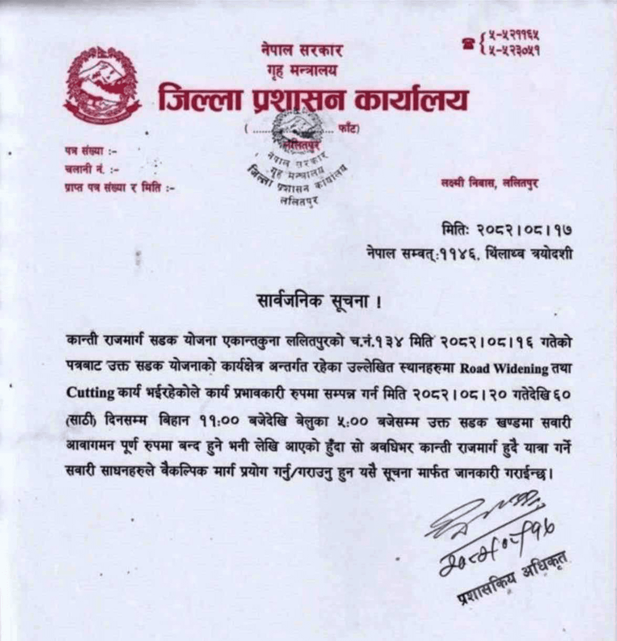 जिल्ला प्रशासन कार्यालय ललितपुरले एक सूचना जारी गर्दै सडक स्तरोन्नतिको कामका लागि ६० दिनसम्म दिउँसोको समयमा सवारी साधन सञ्चालनमा रोक लगाएको हो ।