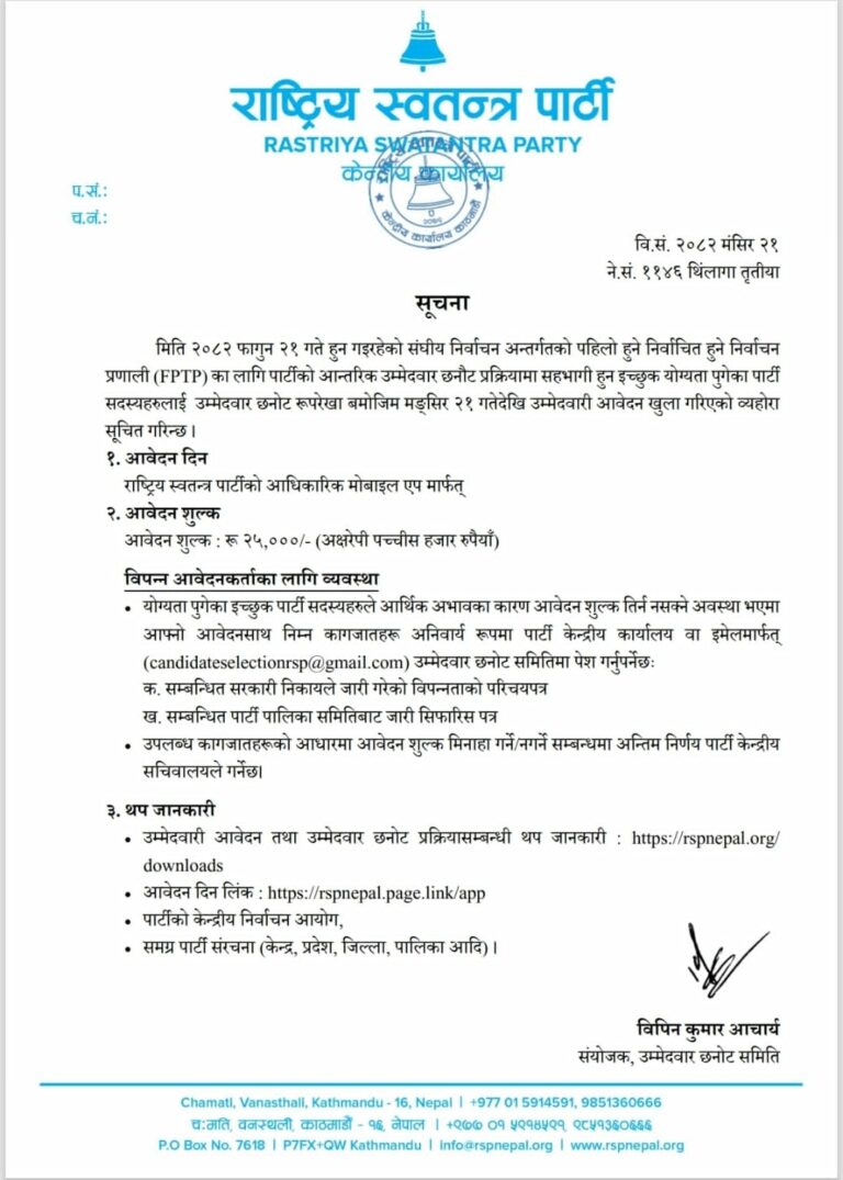 पार्टीको मोबाइल एपबाट आवेदन मागिएको छ आवेदन शुल्क २५ हजार तोकिएको छ ।