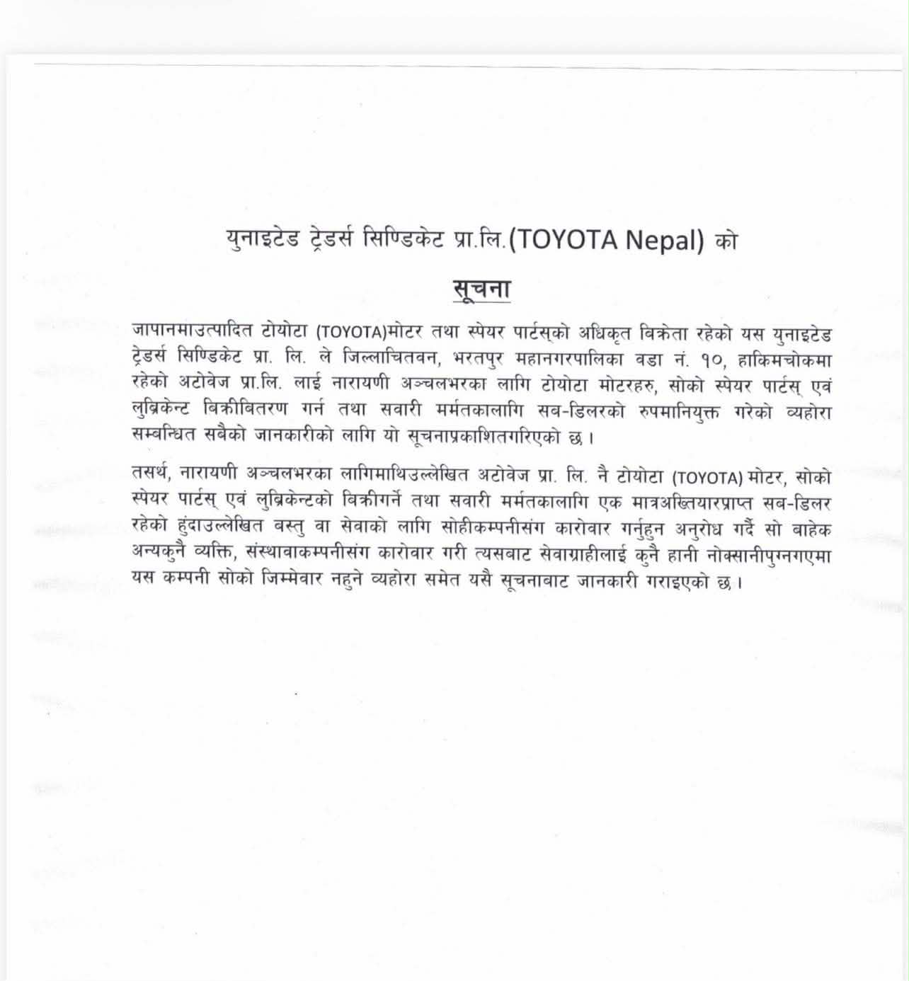 युनाइटेड ट्रेडर्स सिन्डिकेट प्रा.लि. (टोयोटा नेपाल) ले नारायणी अञ्चलका लागि टोयोटा मोटर, स्पेयर पार्ट्स तथा लुब्रिकेन्टको बिक्री–वितरण र सवारी मर्मत सेवाका लागि अटोवेज प्रा.लि. मात्रै आधिकारिक सब–डिलरको रूपमा रहेेेको जनाएको छ।