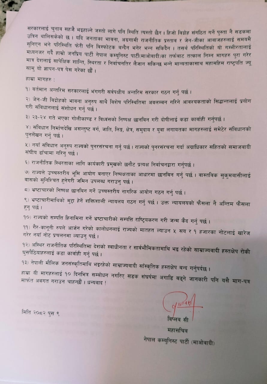 ‘ज्ञापनपत्रमा भनिएको छ , ‘यदि जनताका भावना, अग्रगामी राजनीतिक प्रस्ताव र जेनजीका आवाजहरूलाई समयमै सुनिएन भने परिस्थिति फेरी पनि विस्फोटक बन्दैन भनेर भन्न सकिँदैन । तसर्थ परिस्थितिको यो गम्भीरतालाई मध्यनजर गर्दै हाम्रो जनप्रिय पार्टी नेपाल कम्युनिस्ट पार्टी (माओवादी) का तर्फबाट तत्काल निम्न मागहरू पूरा गरेर मात्र देशलाई सापेक्षिक शान्ति, स्थिरता र निर्वाचनतिर लैजान सकिन्छ भन्ने मान्यताकासाथ महामहिम राष्ट्रपति ज्यू सामु यो ज्ञापन पत्र पेस गरेका छौँ’।