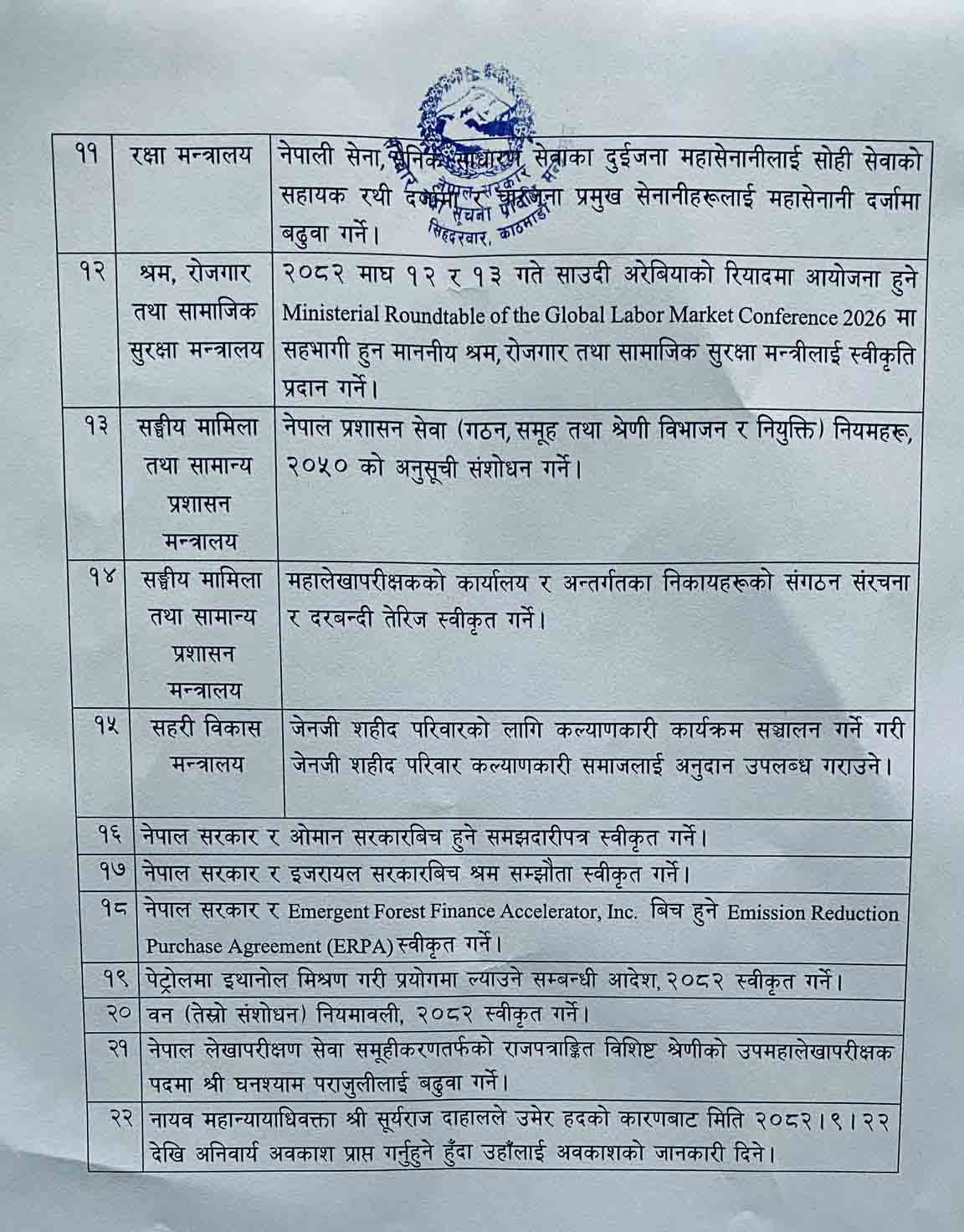 त्यस्तै मन्त्रिपरिषद्ले माघ ३ गते अमेरिकामा आयोजना हुने रोल अफ एनआरएनए युथ इन डेभलपमेन्ट अफ नेपाल पोस्ट जेनजिओ रिभोलुसन सम्बन्धी कार्यक्रममा सहभागी हुन युवा तथा खेलकुद मन्त्रीलाई स्वीकृति प्रदान गर्ने निर्णय भएको गरेको छ भने नेपाली सेना सैनिक साधारण सेवाका दुई जना महासेनानीलाई सोहि सेवाको सहायक रथी दर्जामा र चार जना प्रमुख सेनानीहरूलाई महासेनानी दर्जामा बढुवा गर्ने निर्णय गरेको छ।