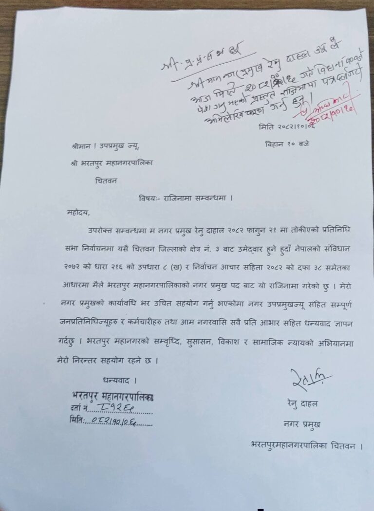 भरतपुर महानगरपालिका प्रमुख रेनु दाहालले राजीनामा दिनुभएको छ ।