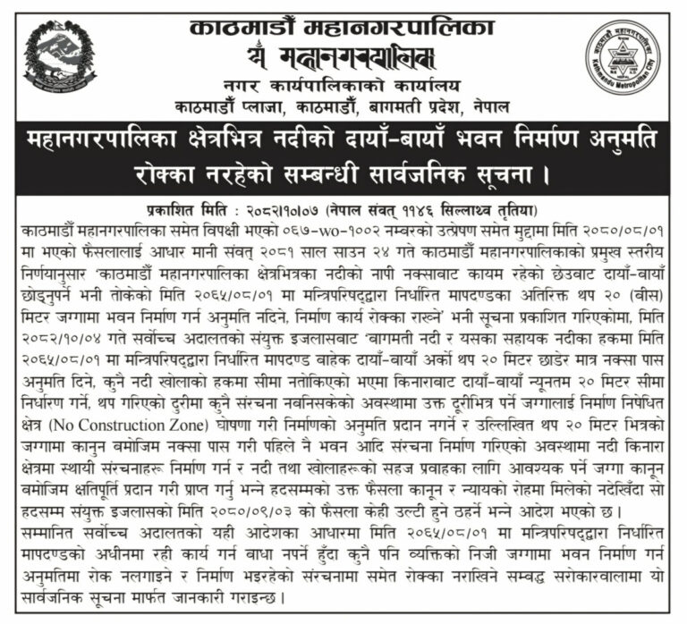 ‘सर्वोच्च अदालतको आदेशको आधारमा २०६५ मंसिर १ को मन्त्रिपरिषद्ले निर्धारण गरेको मापदण्डको अधीनमा रही कार्य गर्न बाधा नपर्ने हुँदा कुनै पनि व्यक्तिको निजी जग्गामा भवन निर्माण गर्न अनुमतिमा रोक नलगाइने र निर्माण भइरहेको संरचनामा समेत रोक्का नराखिने जानकारी गराइन्छ,’ महानगरपालिकाले जारी गरेको सूचनामा भनिएको छ।