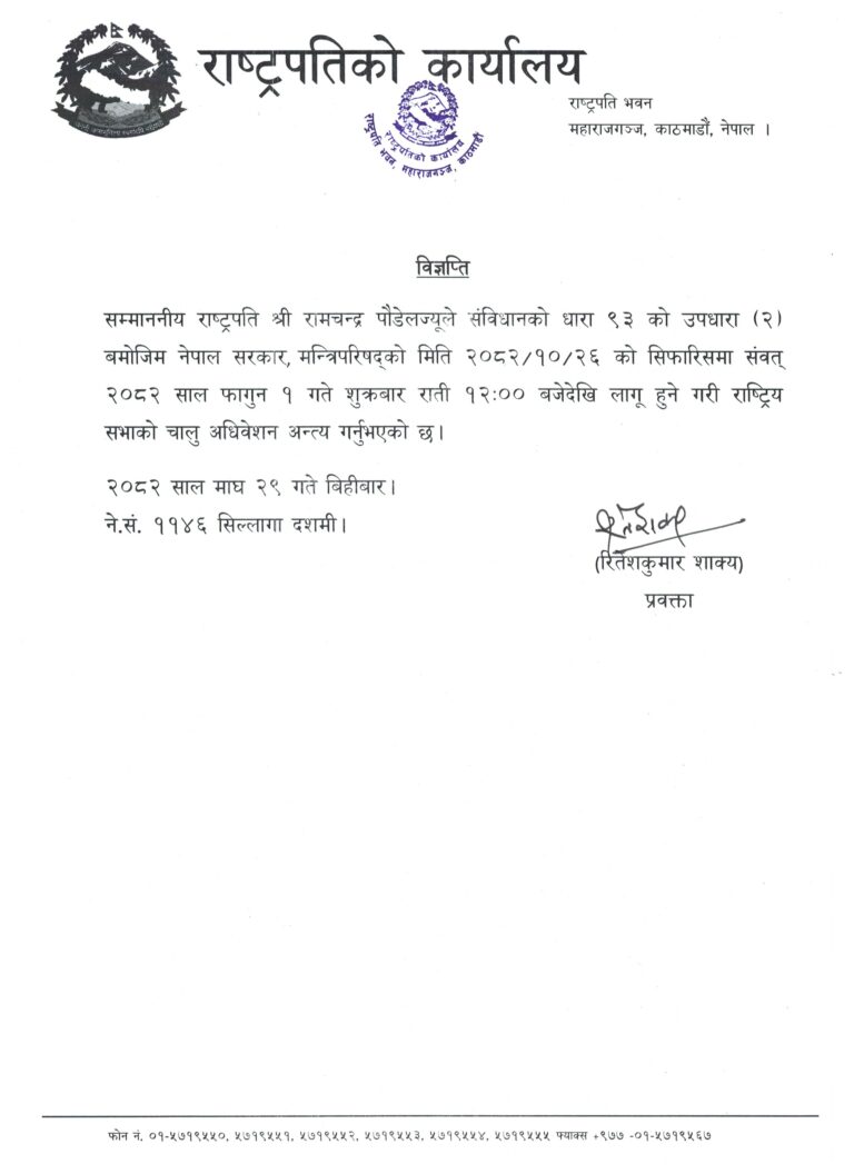 मन्त्रिपरिषद्को सिफारिसमा राष्ट्रियसभाको चालु अधिवेशन अन्त्य गरिएको राष्ट्रपतिको कार्यालयका प्रवक्ता रितेशकुमार शाक्यले बिहीबार (माघ २९) जारी गरेको विज्ञप्तिमा उल्लेख छ ।