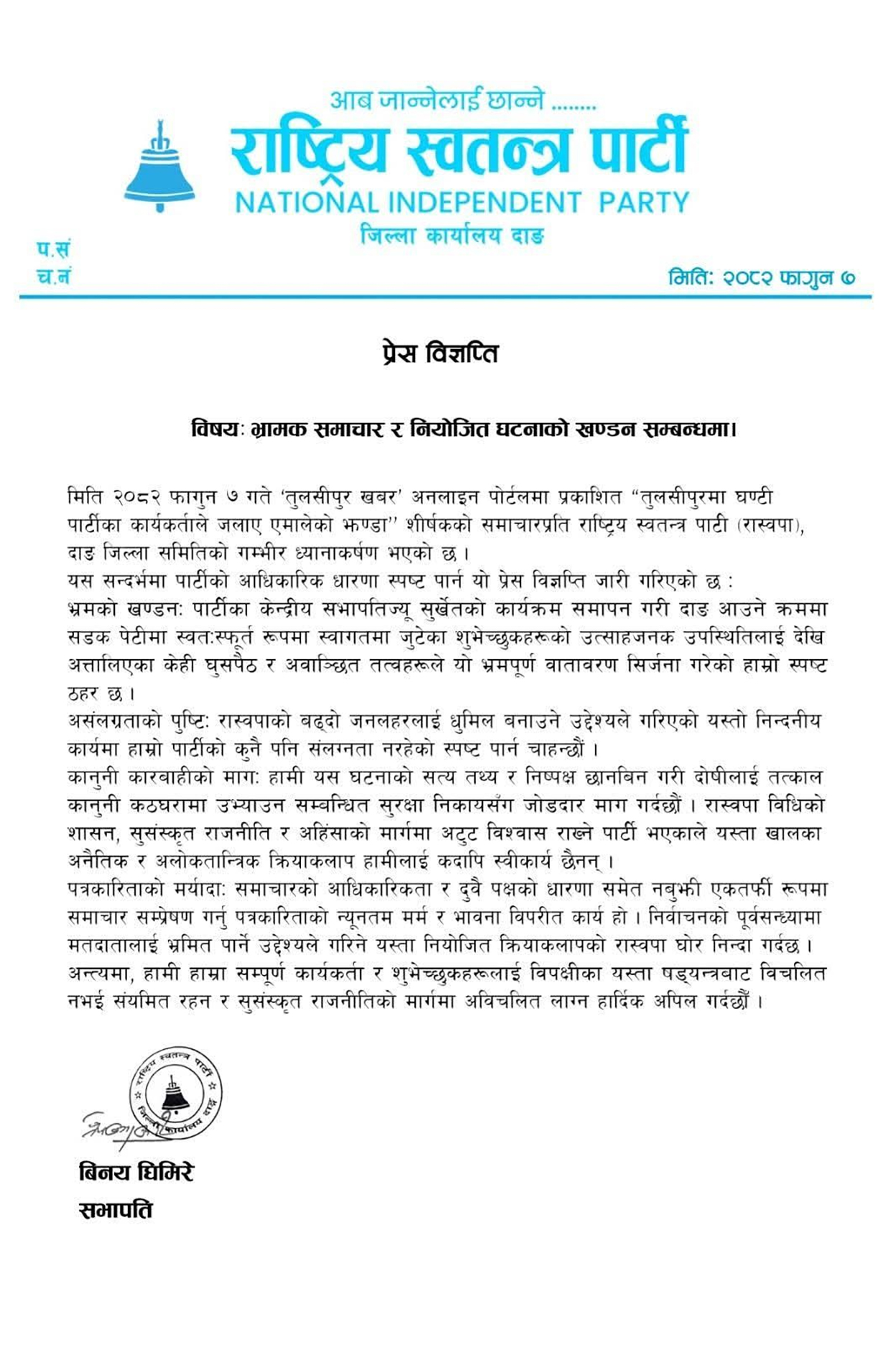 रास्वपा दाङ जिल्ला सभापति बिनय घिमिरेले पनि विज्ञप्ति निकालेर आफूहरुले झण्डा नजलाएको जनाएका छन् । ‘रास्वपाको बढ्दो जनलहरलाई धुमिल बनाउने उद्देश्यले गरिएको यस्तो निन्दनीय कार्यमा हाम्रो पार्टीको कुनै पनि संलग्नता नरहेको स्पष्ट पार्न चाहन्छौं,’ विज्ञप्तिमा लेखिएको छ ।