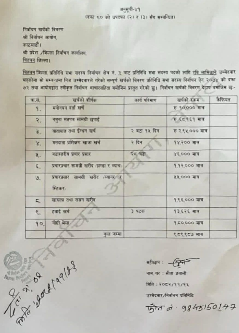 चितवन-२ बाट प्रतिनिधि सभामा निर्वाचित राष्ट्रिय स्वतन्त्र पार्टी(रास्वपा)का सभापति रवि लामिछानेले आफ्नो निर्वाचन खर्च विवरण सार्वजनिक गरेका छन् ।