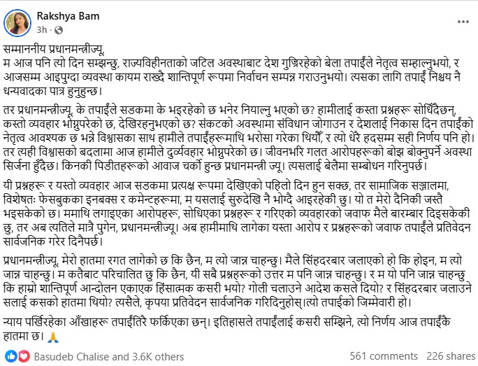 उनले जटिल अवस्थामा देशको नेतृत्व सम्हालेर निर्वाचन सम्पन्न गराएकोमा प्रधानमन्त्रीलाई धन्यवाद दिँदै वर्तमान समयमा सडक र सामाजिक सञ्जालमा युवाहरूले भोग्नुपरिरहेको दुर्व्यवहारप्रति चिन्ता व्यक्त गरेकी छिन् ।