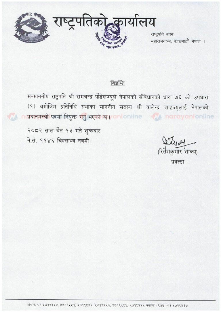 राष्ट्रपति भवन, महाराजगञ्जबाट जारी विज्ञप्तिमा भनिएको् छ, ‘सम्माननीय राष्ट्रपति श्री रामचन्द्र पौडेलज्यूले नेपालको संविधानको धारा ७६ को उपधारा ९१० बमोजिम प्रतिनिधि सभाका माननीय सदस्य श्री वालेन्द्र शाहज्यूलाई नेपालको प्रधानमन्त्री पदमा नियुक्त गर्नु भएको छ ।’