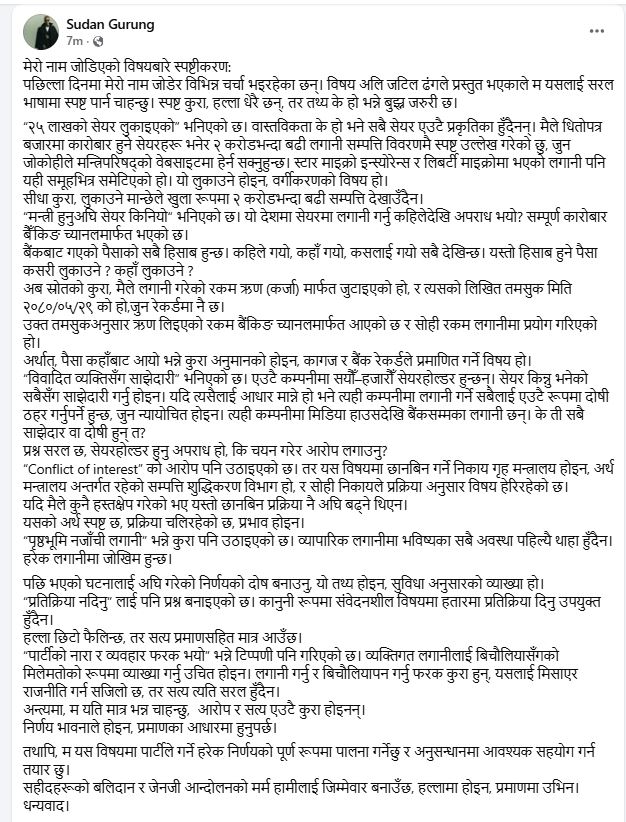 गृहमन्त्री सुधन गुरुङले आफ्नो विषयमा उठेका प्रश्नहरूको जवाफ दिँदै अनुसन्धानमा आवश्यक सहयोग गर्न तयार रहेको बताएका छन् ।