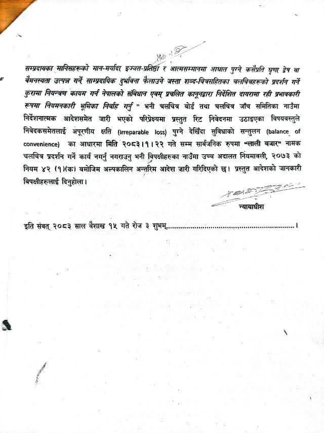 चलचित्र ‘लालीबजार’ को प्रदर्शन तत्कालका लागि रोक्न अदालतको आदेश