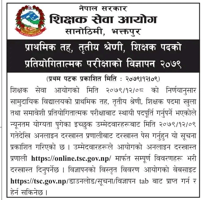 काठमाडौँ – शिक्षक सेवा आयोगले प्राथमिक तहका शिक्षक पदपूर्तिका लागि विज्ञापन खुलाएको छ। आयोगले आज प्रावि तहमा विज्ञापन खुलाएको हो