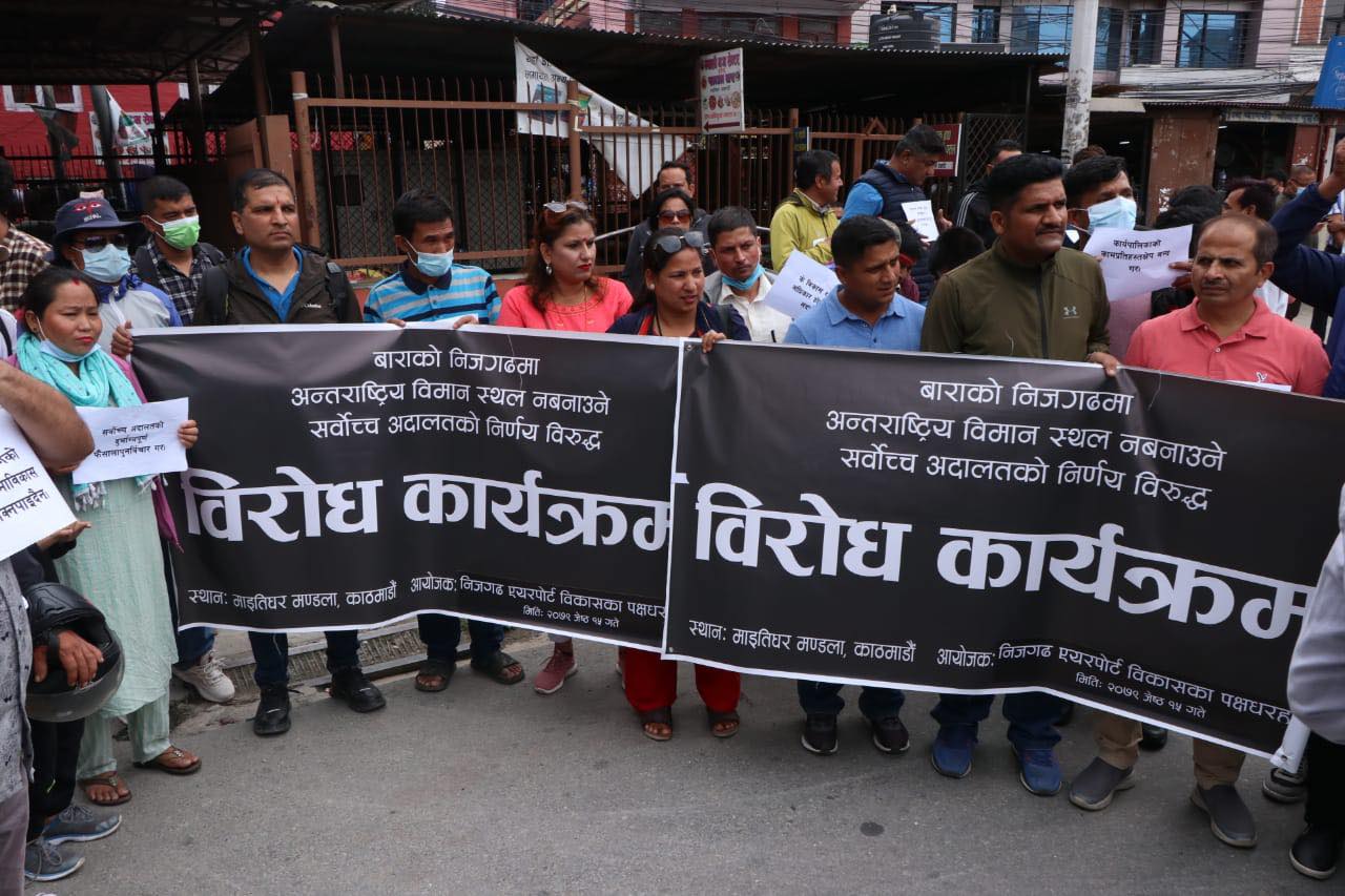 बाराको निजगढमा अन्तर्राष्ट्रिय विमानस्थद नबनाउन सर्वाेच्च अदालतले दिएको आदेशविरुद्ध आइतबार पनि काठमाडौँमा विरोध प्रदर्शन भएको छ ।