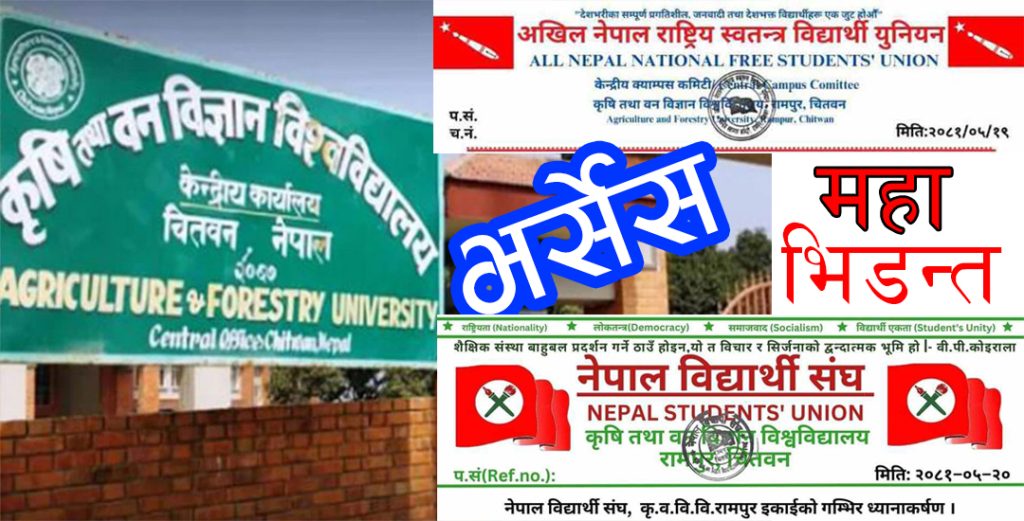 कृषि तथा वन विज्ञान विश्वविद्यालय रामपुर चितवन (एएफयु)मा भदौ १३ गते अनेरास्ववियु र नेविसंघमा आवद्ध विद्यार्थीहरुबीच झड्प भएदेखि विश्वविद्यालयमा पठनपाठन ठप्प छ । झड्प भए यता दुबै संगठनले विज्ञप्ति निकाल्दै एकले अर्कालाई आरोप लगाइरहेका छन्, भने प्रहरीले घटनाको अनुसन्धान गरिरहेको छ ।