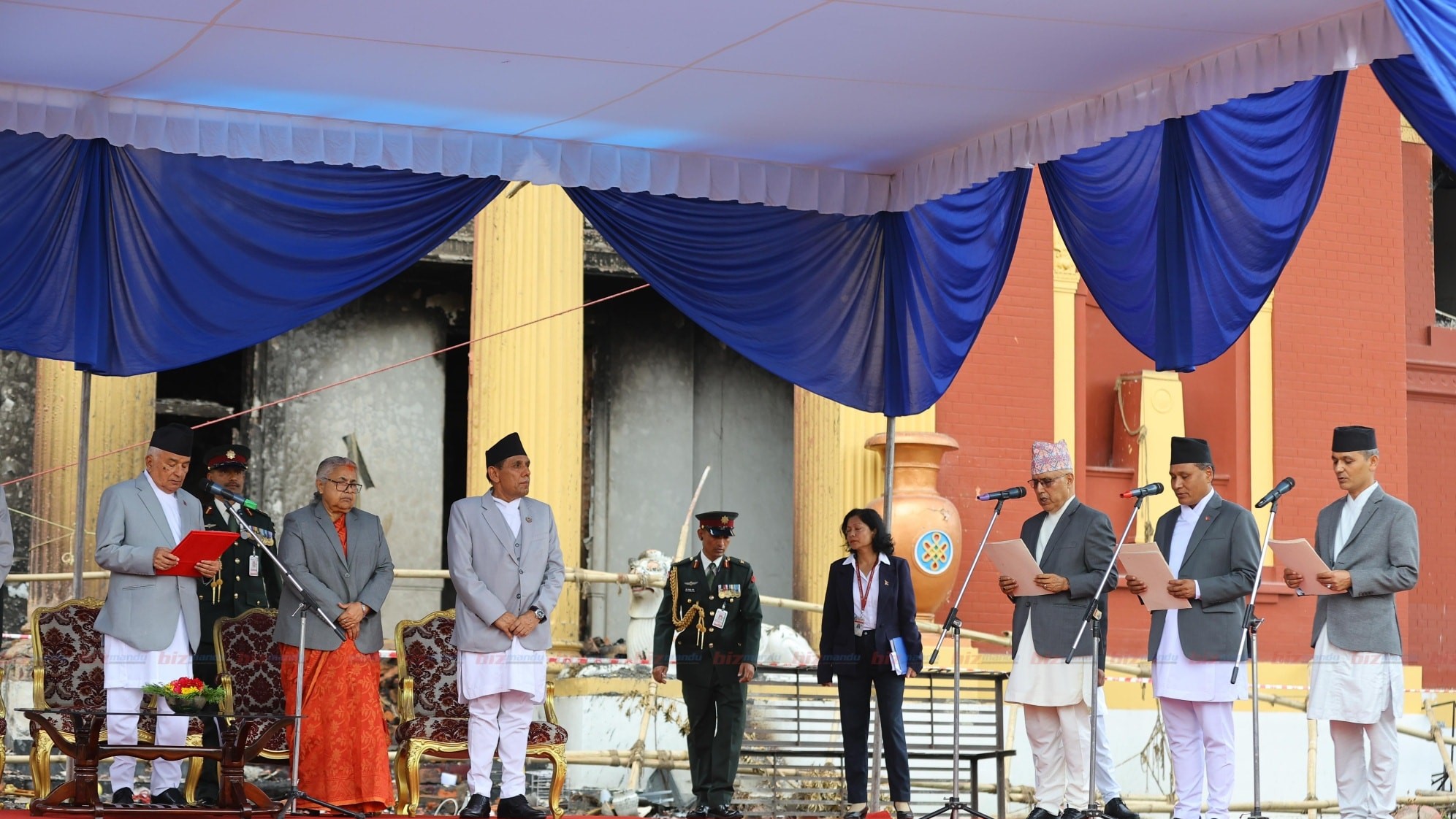 शीलतनिवासको खण्डहर भवन बाहिर तीन मन्त्रीले लिए शपथ