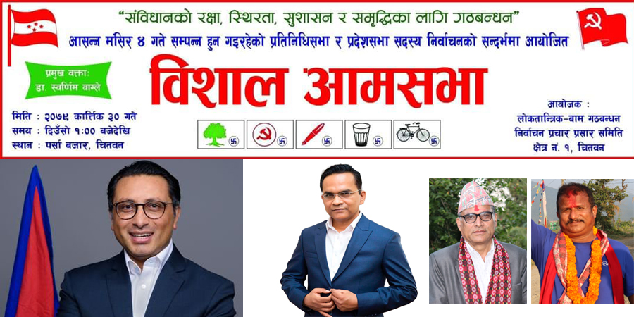 चितवन–१ मा गठबन्धनको आमसभा आज, डा स्वर्णीम वाग्लेले सम्बोधन गर्ने