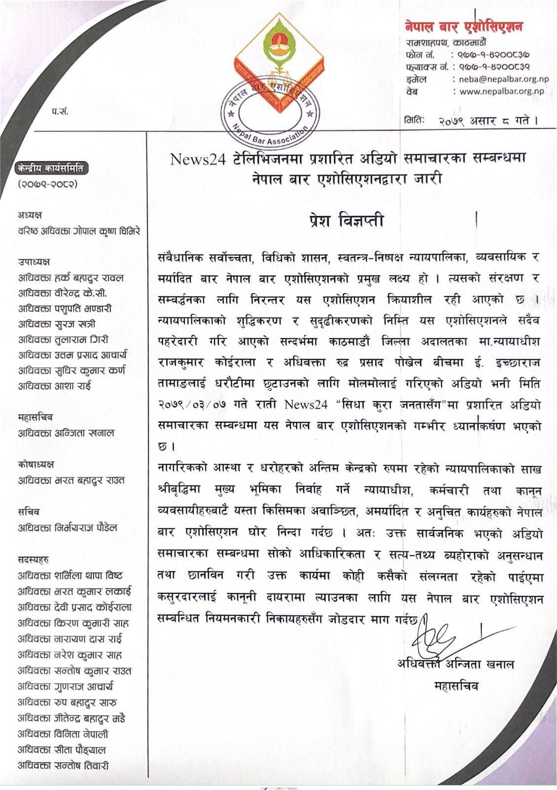 न्यायाधीश-अधिवक्ता घुस डिल प्रकरणका दोषीलाई कारबाही गर्न नेपाल बारको माग