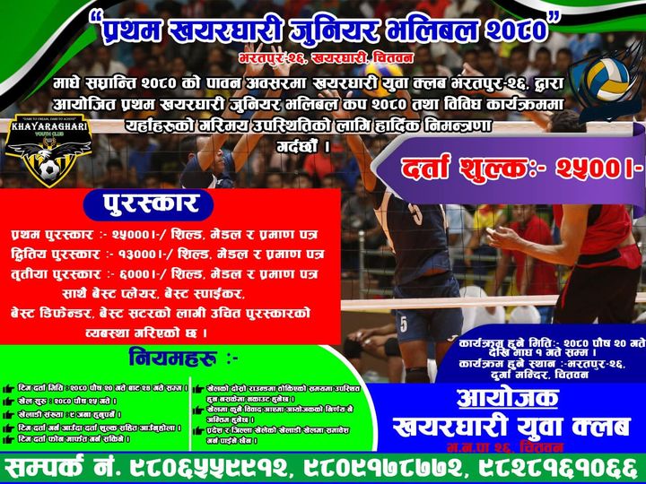 भरतपुरमा आजदेखि प्रथम खयरघारी जुनियर भलिबल कप २०८० सुरु