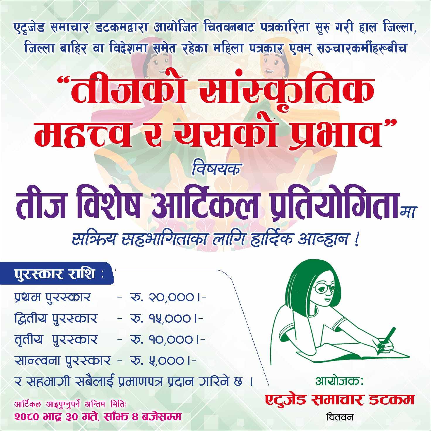 एटुजेड समाचारले महिला पत्रकारबीच तीज विशेष आर्टिकल लेखन प्रतियोगिता गर्ने