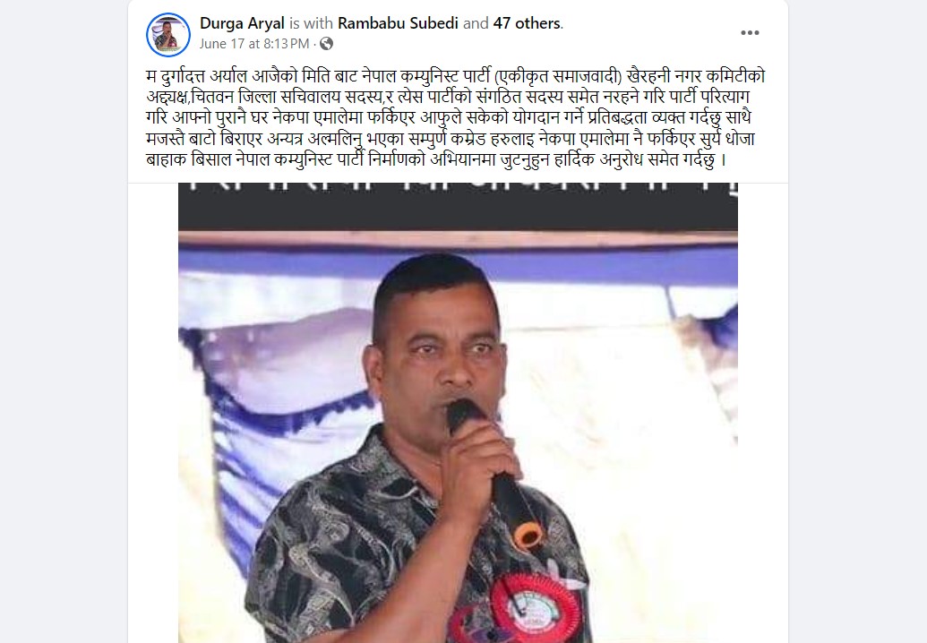 नेकपा एसका खैरहनी नगर अध्यक्ष दुर्गा अर्याल एमाले प्रवेश