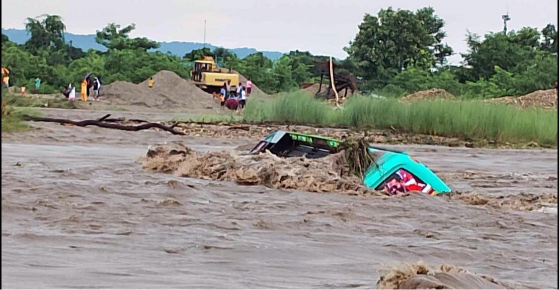 माडीको घाँघर खोला तर्दै गरेको बस बाढीले पल्टायो, यात्रु सकुशल