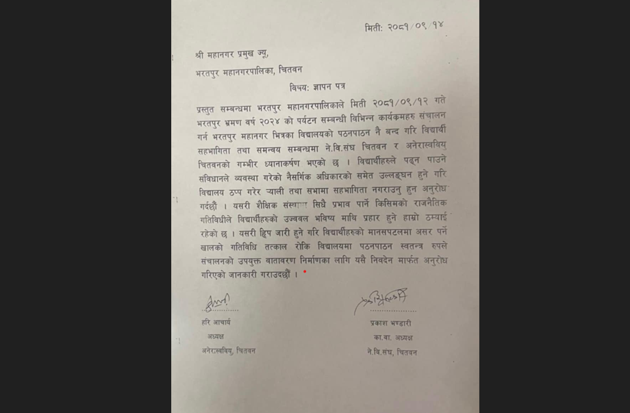 भरतपुर भ्रमण वर्षको कार्यक्रममा विद्यार्थीलाई सहभागि नगराउन महानगरलाई नेविसंघ चितवन र अनेरास्ववियुको आग्रह