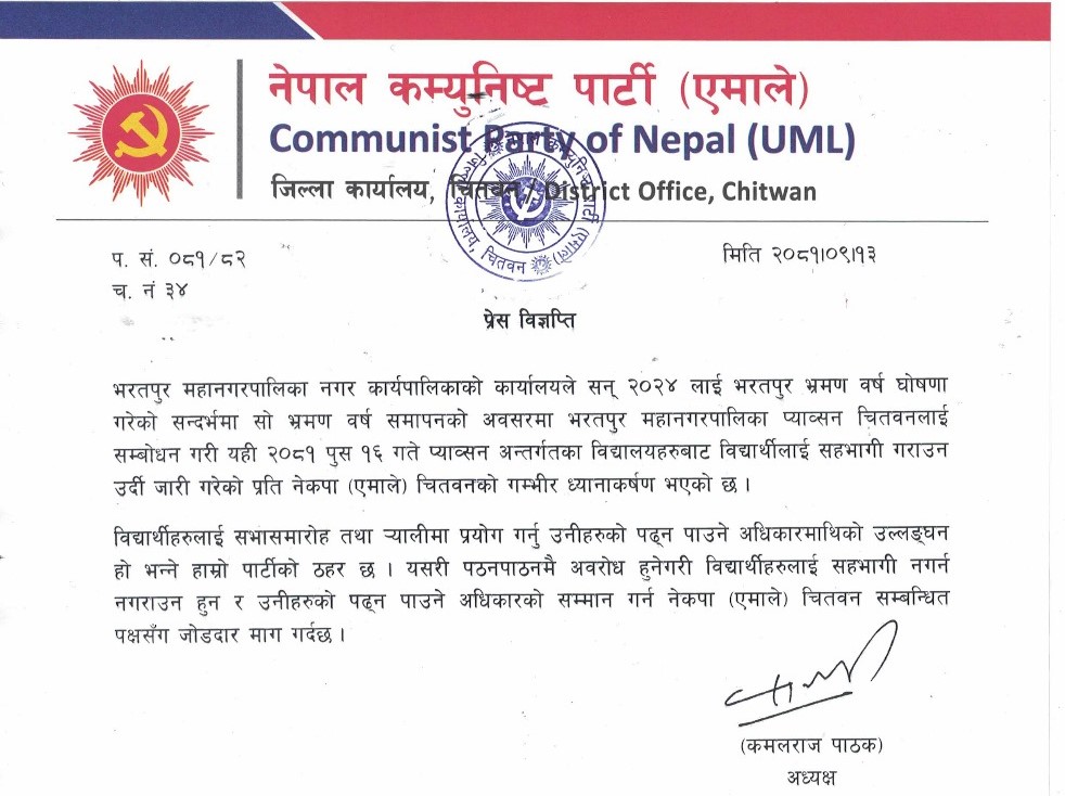भरतपुर भ्रमण वर्षको कार्यक्रममा विद्यार्थीलाई सहभागि नगराउन महानगरलाई एमालेको आग्रह