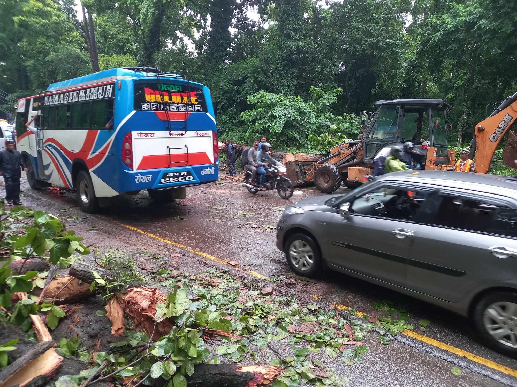 आँपटारीमा रुख र बिजुलीको पोल ढल्यो, नारायणगढ-मुग्लिङ सडकखण्ड अवरुद्ध