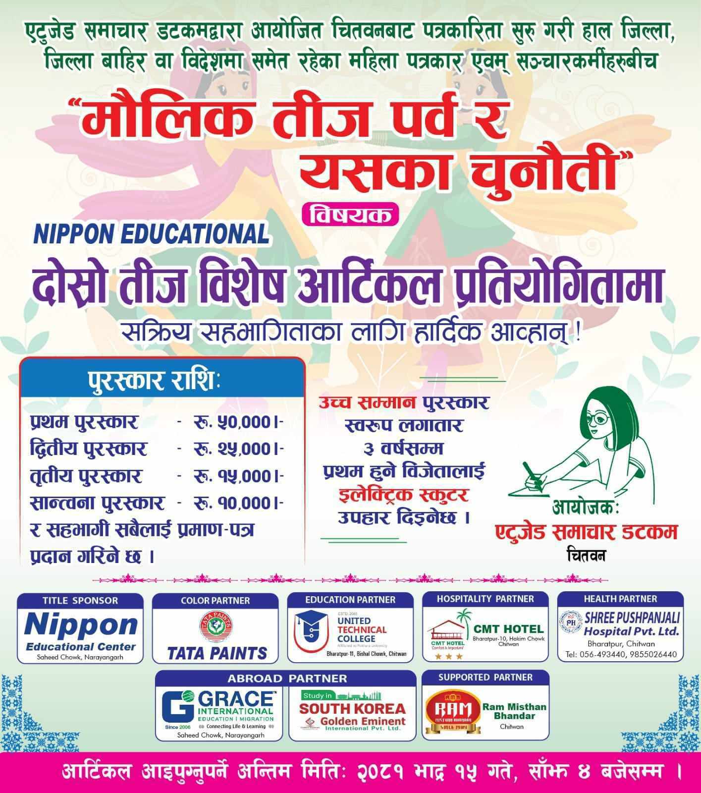 एटुजेड समाचारले महिला पत्रकार एवम् सञ्चारकर्मीबीच तीज विशेष आर्टिकल लेखन प्रतियोगिता गर्ने