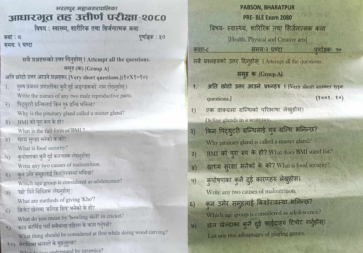 भरतपुर महानगरले निकालेको प्रश्नपत्र र प्याब्सनको पुर्व तयारी परिक्षाको प्रश्नपत्र हुबहु