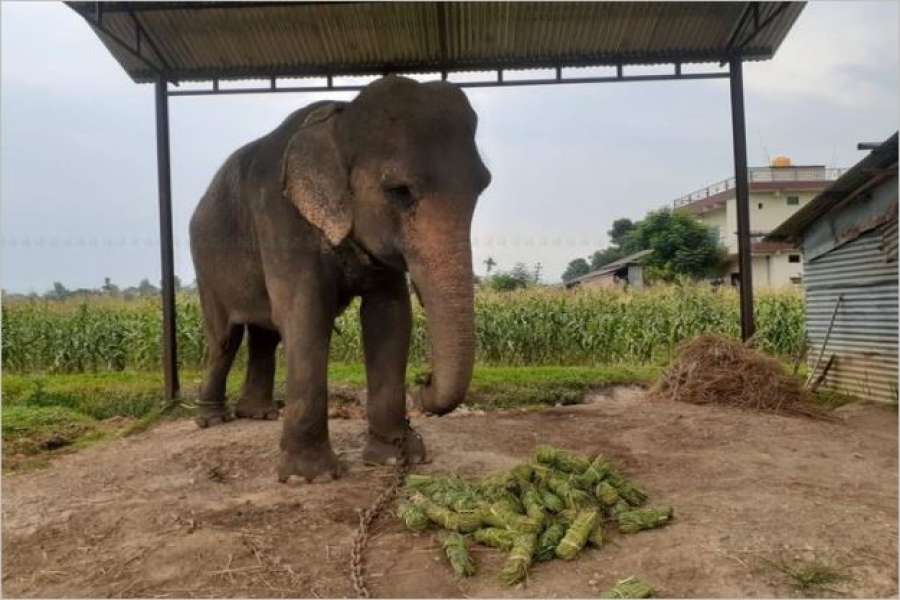 सुँड काटिएको सौराहाको हात्तीले दाना खान थाल्यो