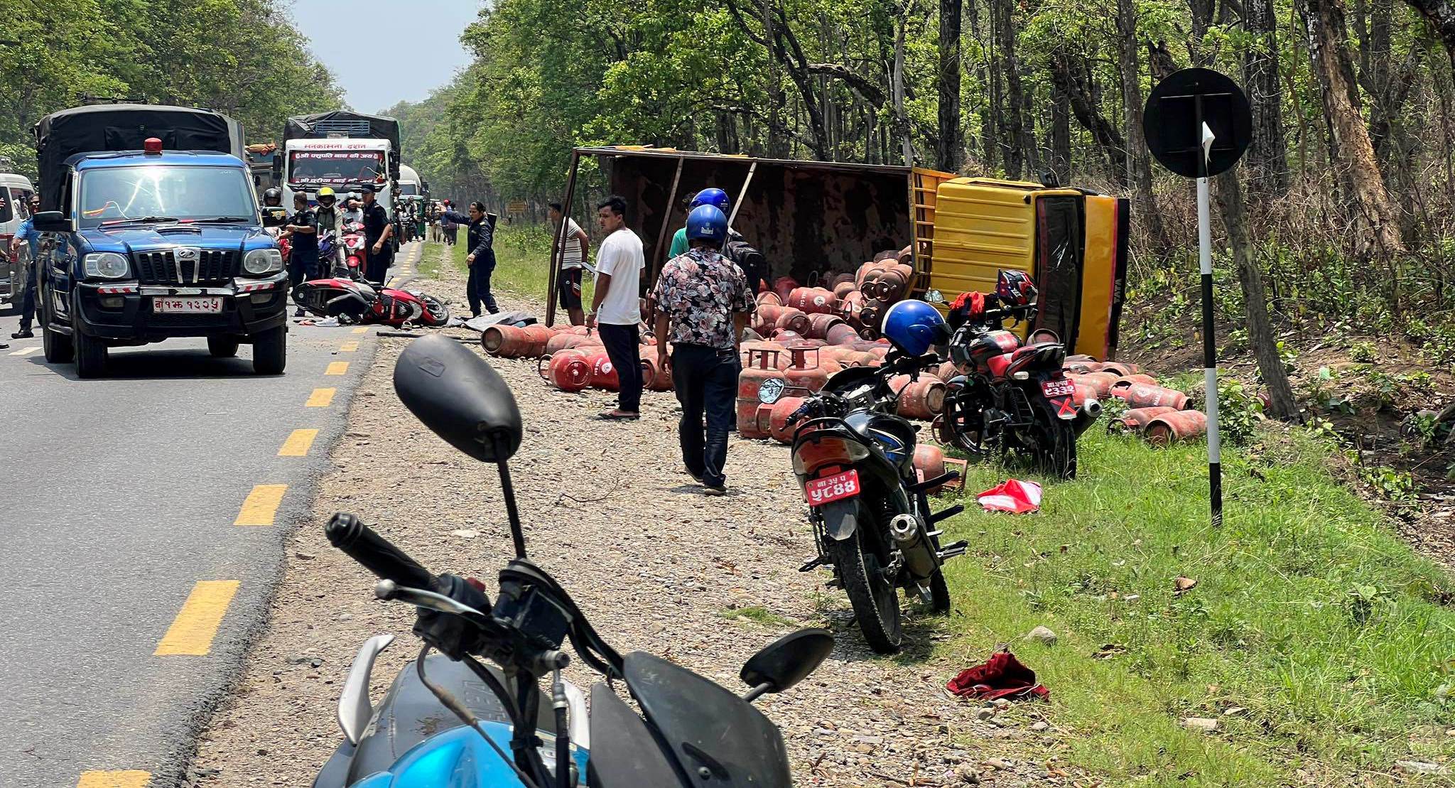 चितवनमा ग्यास बोकेको ट्रक र स्कुटर दुर्घटना, सडकभरी सिलिण्डर छरिएपछि…