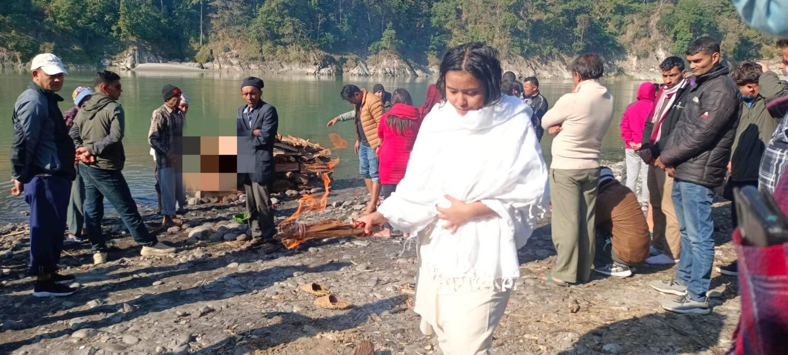 चितवनकी सञ्चारकर्मी रिना आमालाई दागबत्ती दिएर किरिया बस्दै ,गलत मान्यता बदल्दै छोरी