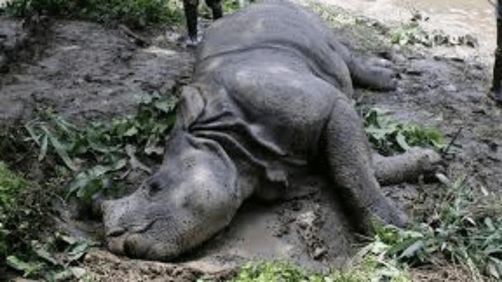 चितवनमा बङ्गुरफार्ममा लगाइएको बिजुलीको तारमा करेन्ट लागेर गैँडाको मृत्यु