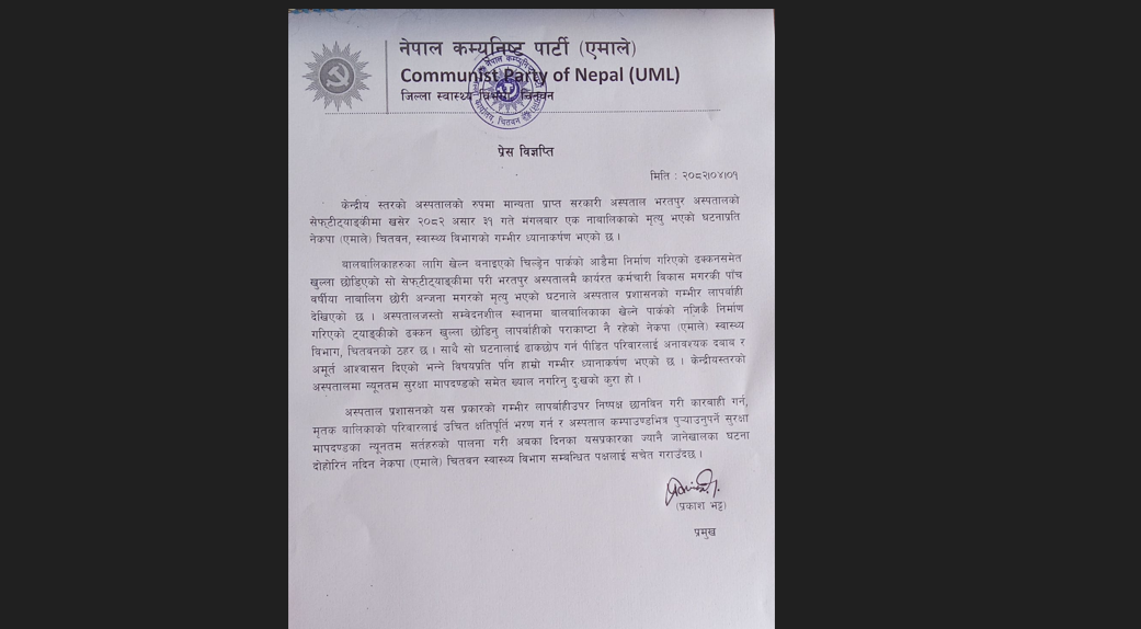 भरतपुर अस्पतालमा नाबालिका मृत्यु प्रकरण : एमाले स्वास्थ्य विभाग चितवनको गम्भीर ध्यानाकर्षण