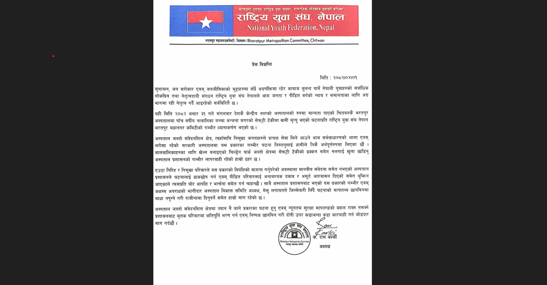 भरतपुर अस्पतालमा नाबालिका मृत्यु प्रकरण : राष्ट्रिय युवा संघ नेपाल भरतपुरको गम्भीर ध्यानाकर्षण