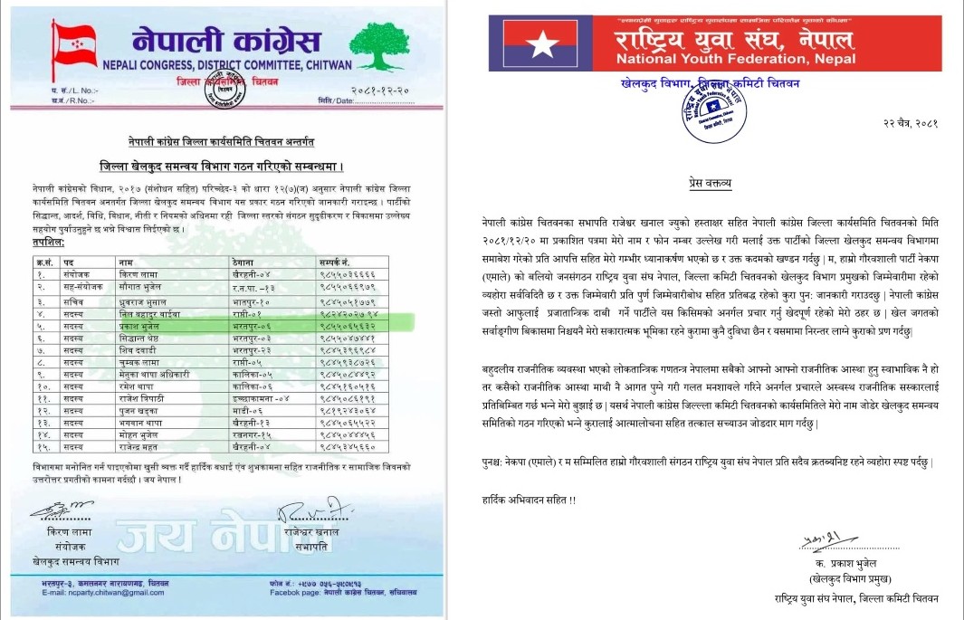 काँग्रेस चितवनको खेलकुद विभागमा एमालेका खेलकुद प्रमुखको नाम राखिएपछि…