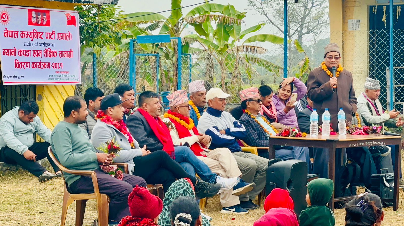 एमाले राप्ती ६ चितवनद्वारा विद्यालयमा न्यानो कपडा एवम् शैक्षिक सामग्री वितरण