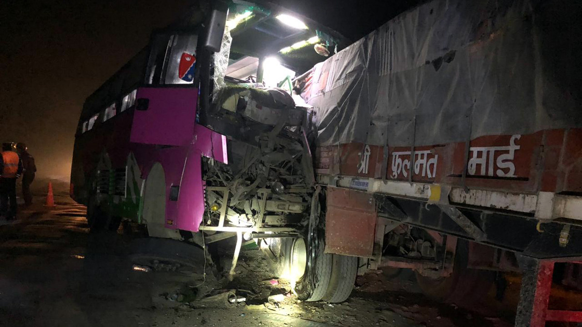 काठमाडौं आउँदै गरेको बस चितवनमा रोकिराखेको ट्रकसँग ठोक्कियो