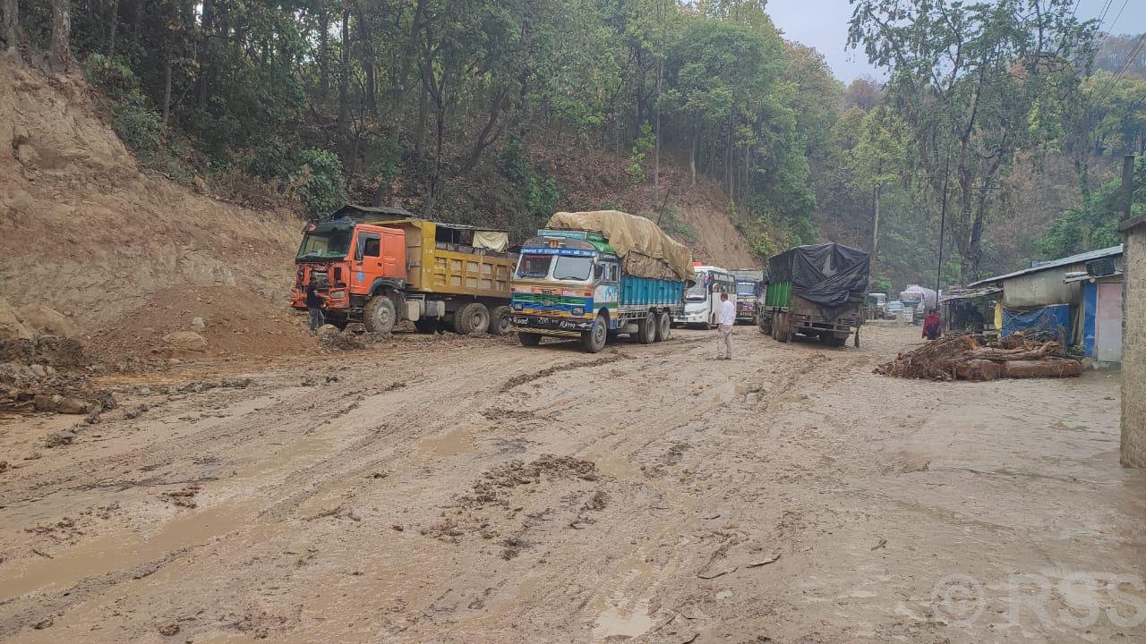 वर्षाका कारण बाटो हिलो र चिप्लो भएपछि बुटवल–नारायणगढ सडक अवरुद्ध