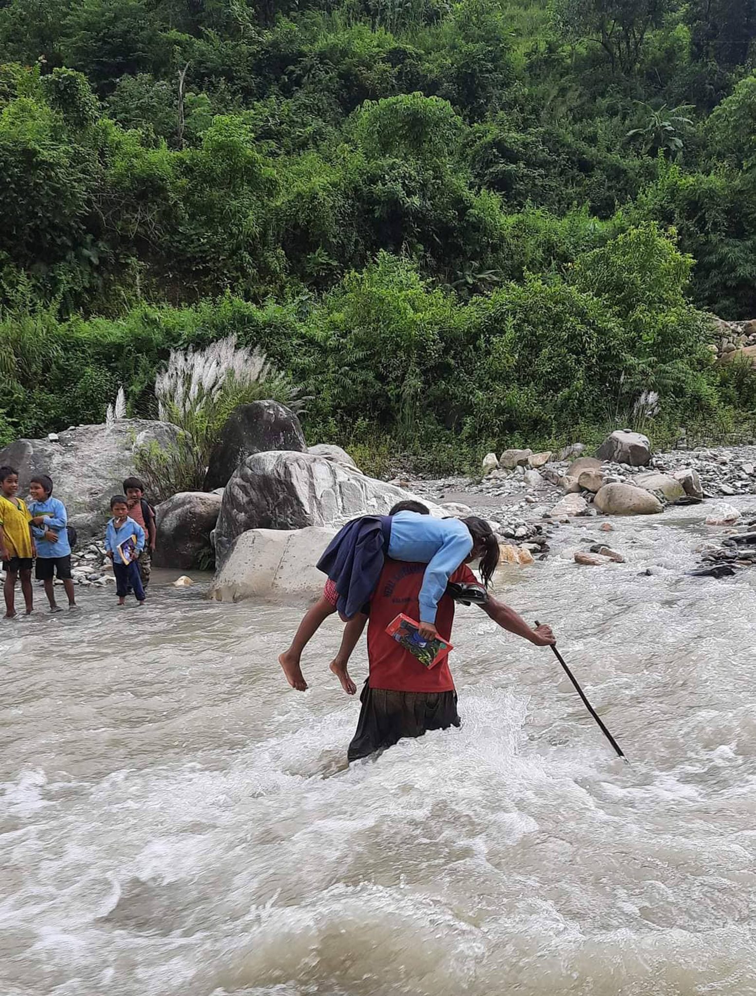 खोलामा पुल नहुँदा विद्यार्थीलाई खोला तारेर भिजेकै कपडामा विद्यालय ल्याउने लाने